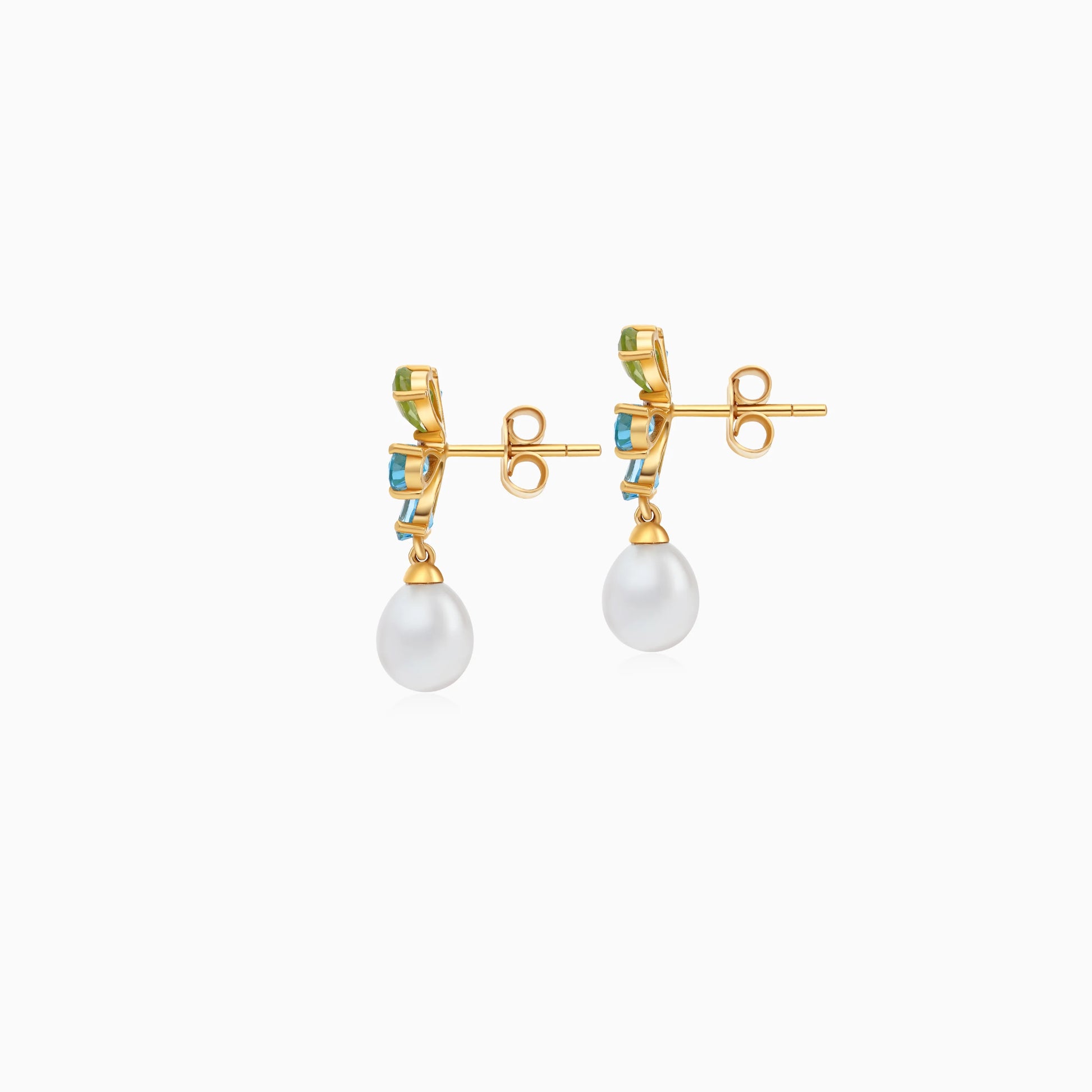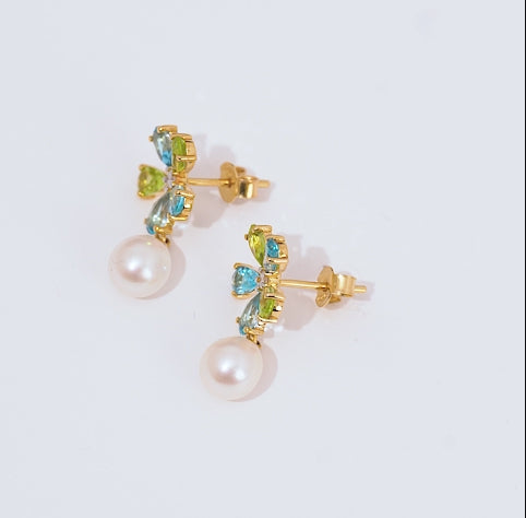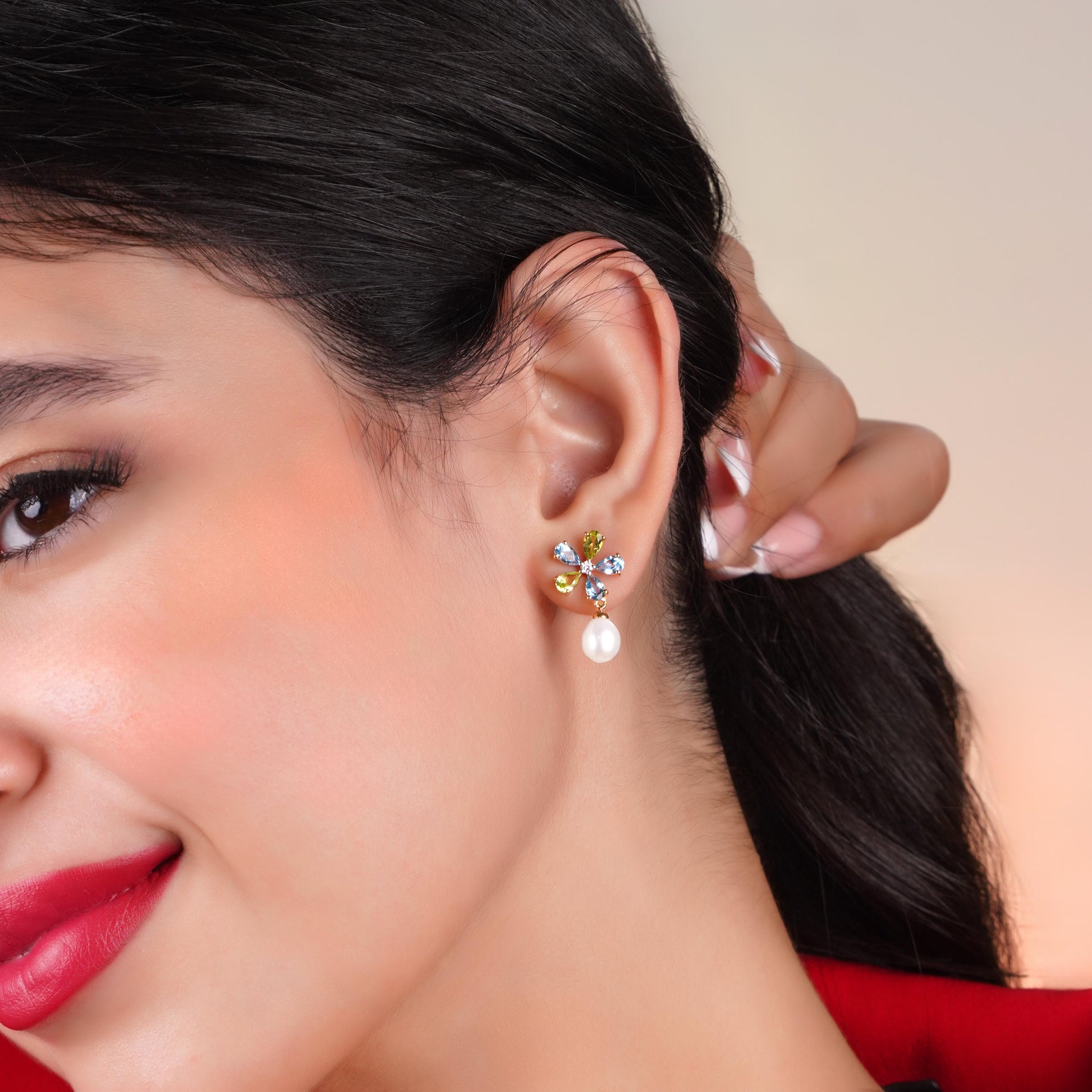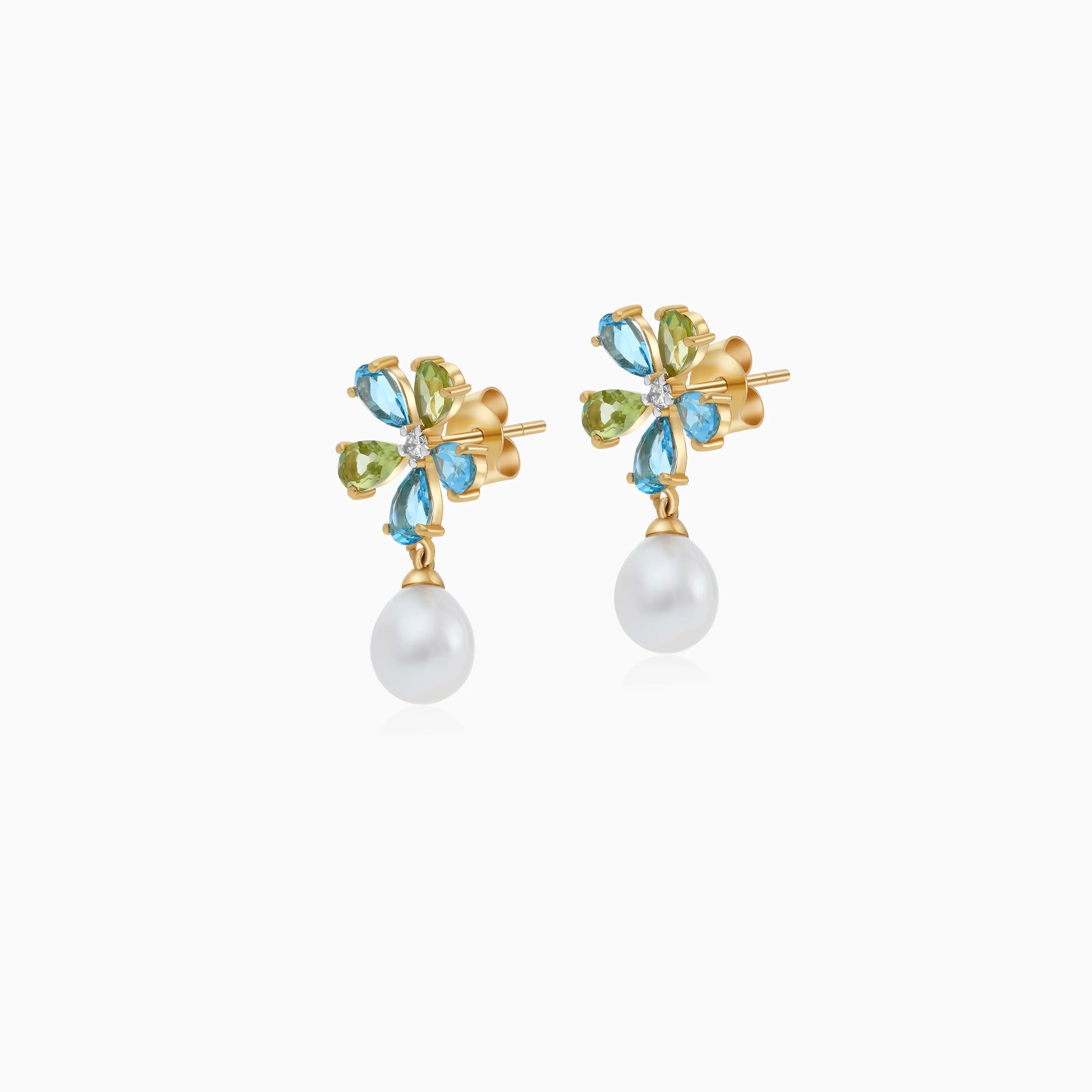 أقراط على شكل زهرة من الذهب الأصفر عيار 18 قيراطًا. صُنعت هذه الأقراط الرائعة بإتقان، وتتميز بتصميمات زهرية دقيقة مزينة بألماس طبيعي متلألئ وأحجار كريمة نابضة بالحياة ولآلئ، مما يضفي لمسة من الرقي والجمال الطبيعي على أي إطلالة.