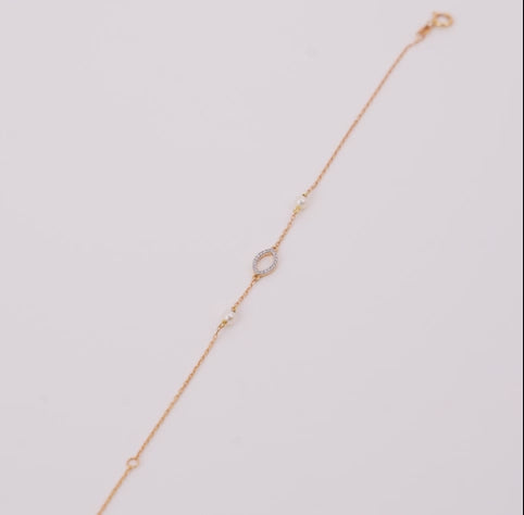 سوار من الذهب الأصفر عيار ١٨ قيراطًا من مجموعة دانا. يتميز بقطعة مركزية بيضاوية الشكل مرصعة بأحجار ألماس طبيعية متلألئة، ومزينة بلآلئ بيضاء براقة، تجسد هذه القطعة الرائعة أناقة خالدة وحرفية راقية. مثالية لإضفاء لمسة من الفخامة على أي إطلالة.