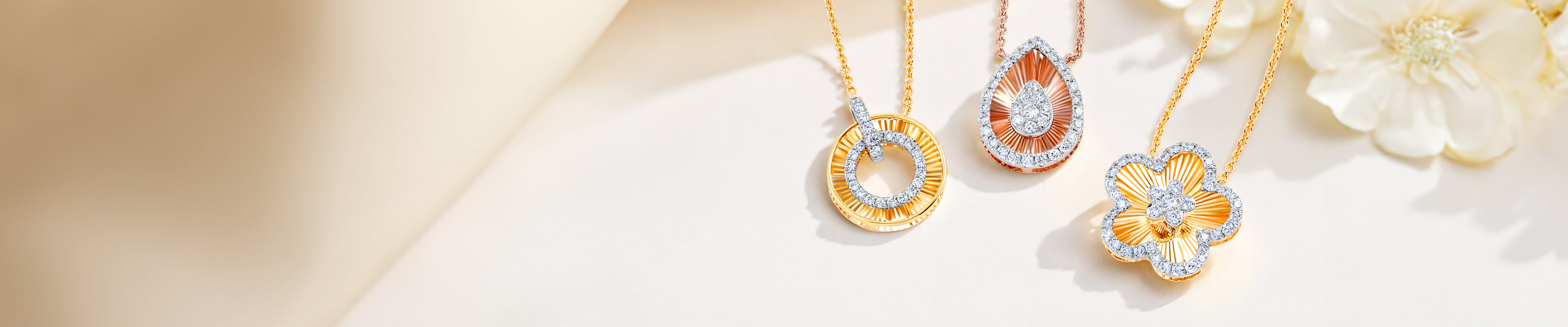 Delicate flower-inspired designs in white, pink, and yellow gold, with vibrant color contrasts and exquisite craftsmanship, creating timeless jewelry that embodies femininity and elegance in every look.