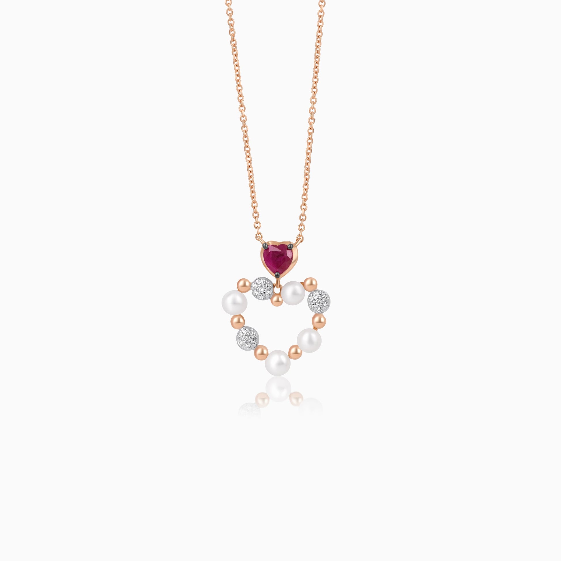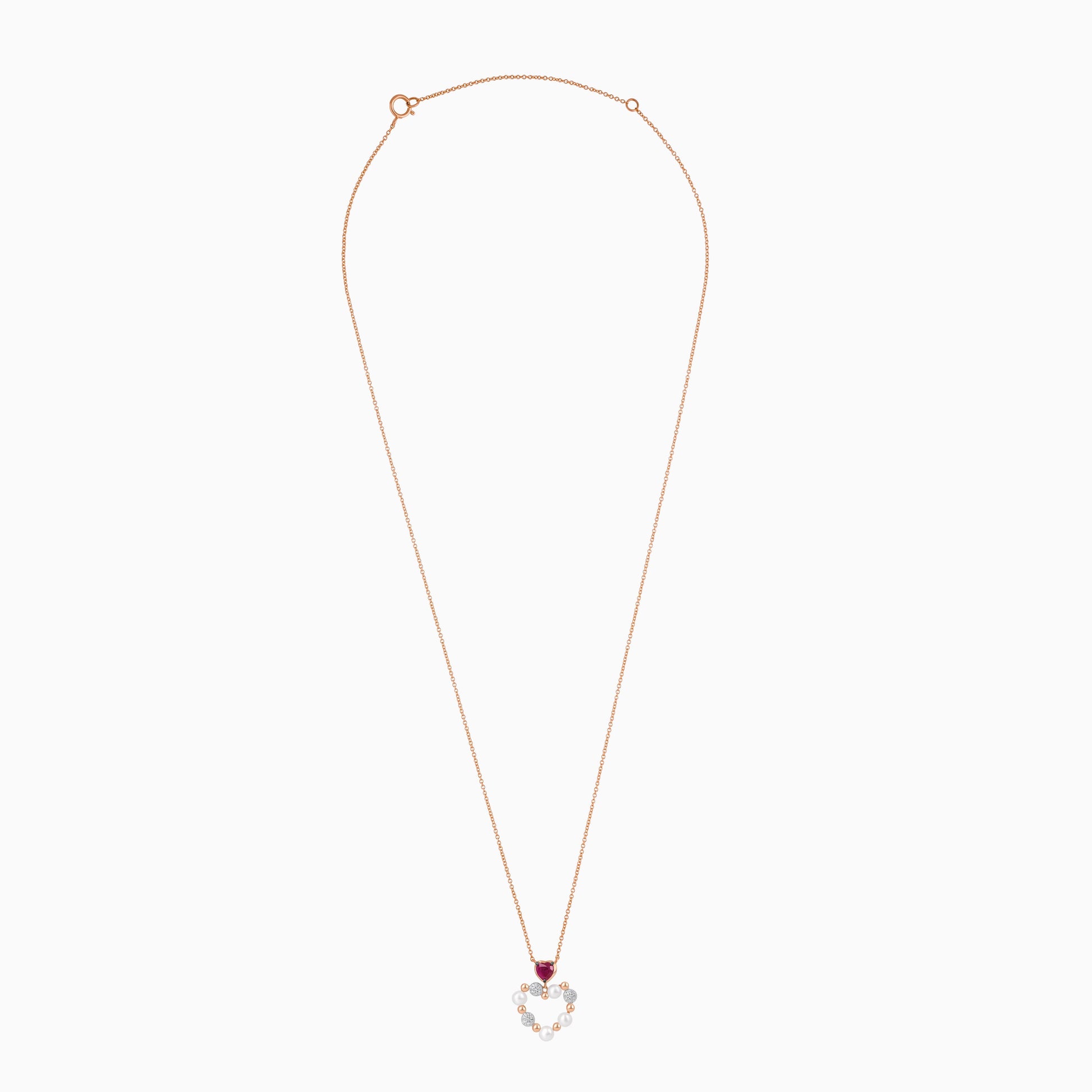 18k rose gold chain with heart-shaped pendant decorated with pearls & natural diamond and ruby | Danah