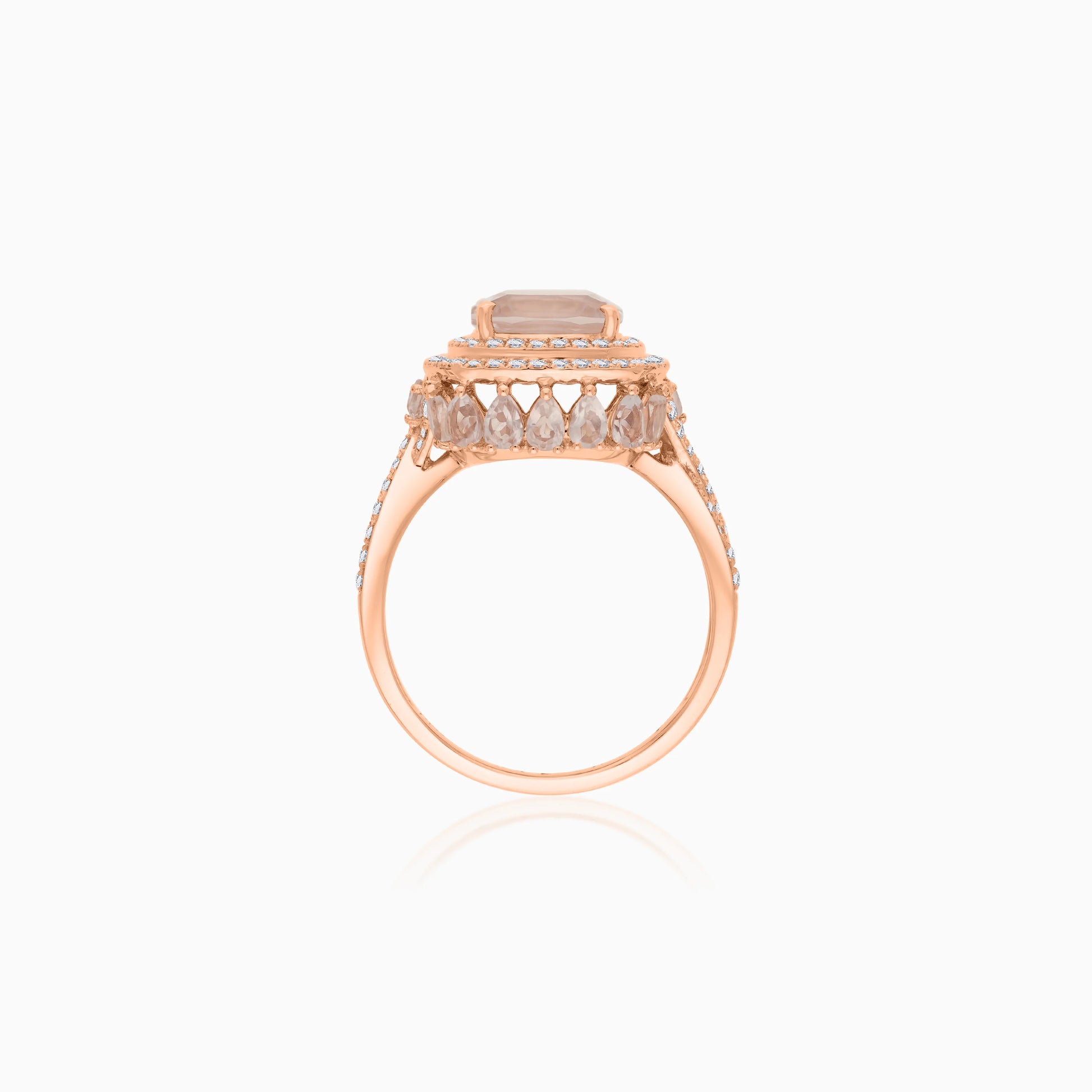 18k Rose gold ring studded with natural diamonds and rose quartz stones. Part of the Vida Collection, this elegant piece showcases timeless beauty and exquisite craftsmanship, making it an ideal choice for adding a touch of sophistication and glamour to any occasion.