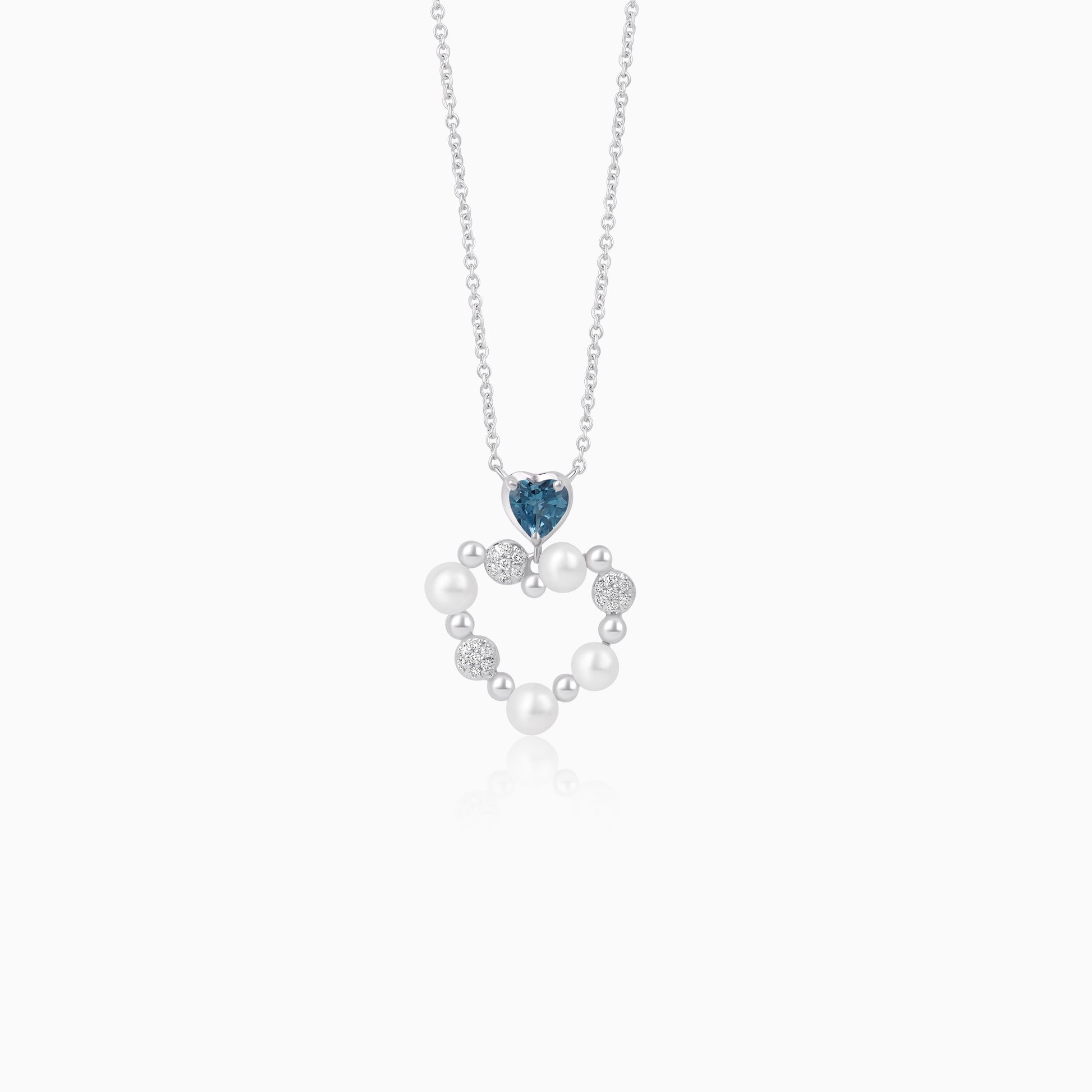 18k white gold chain with heart-shaped pendant decorated with pearls, natural diamond and natural Swiss blue Topaz stones | danah collection