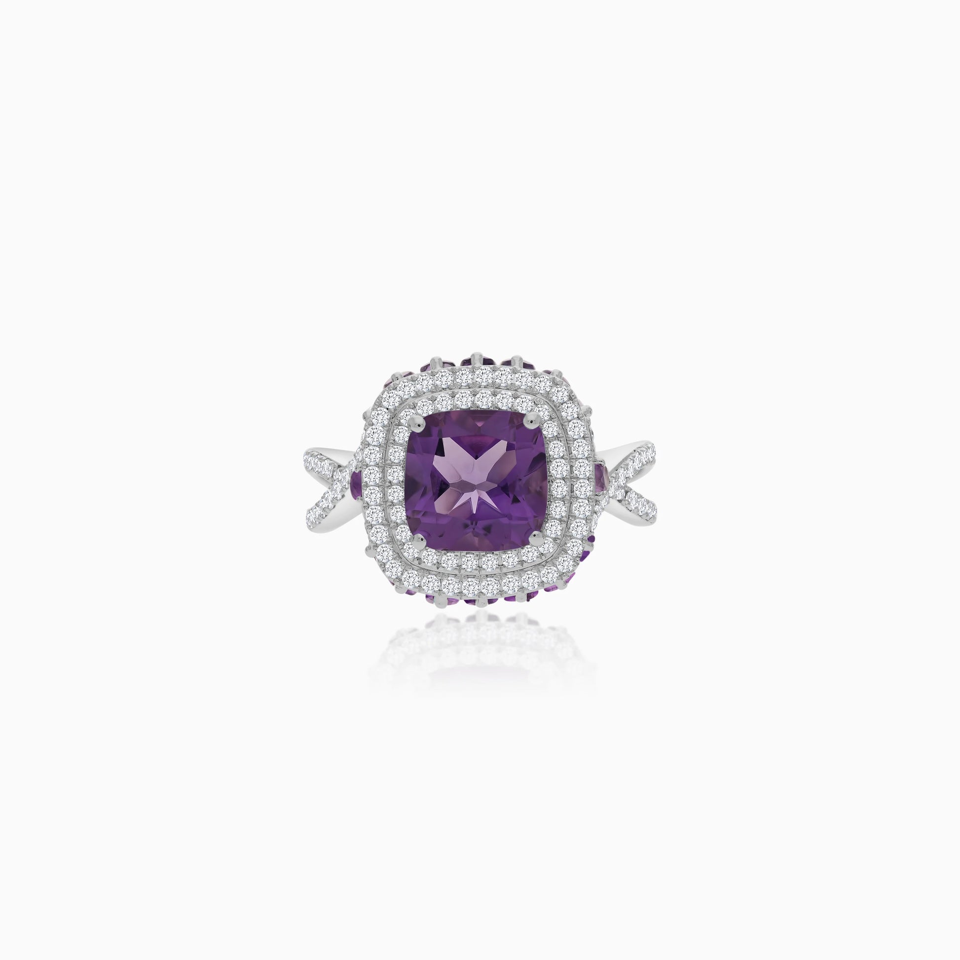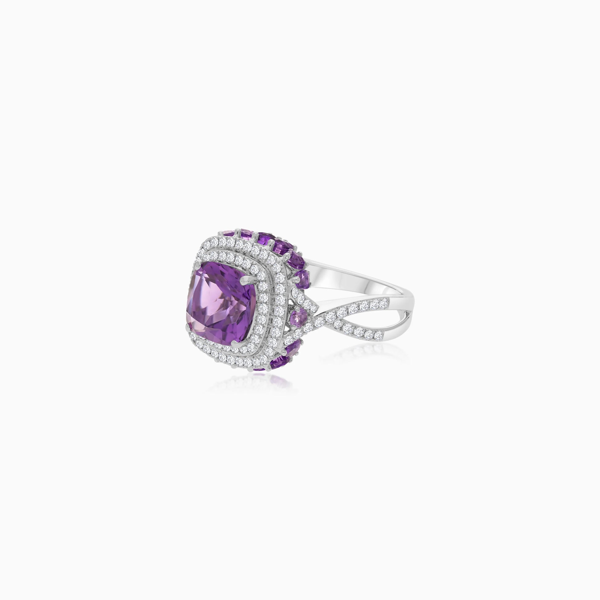 18k White Gold Ring featuring an Amethyst stone, accented by natural diamonds. Part of the Vida Collection, this elegant piece showcases timeless beauty and exquisite craftsmanship, making it an ideal choice for adding a touch of sophistication and sparkle to any occasion.