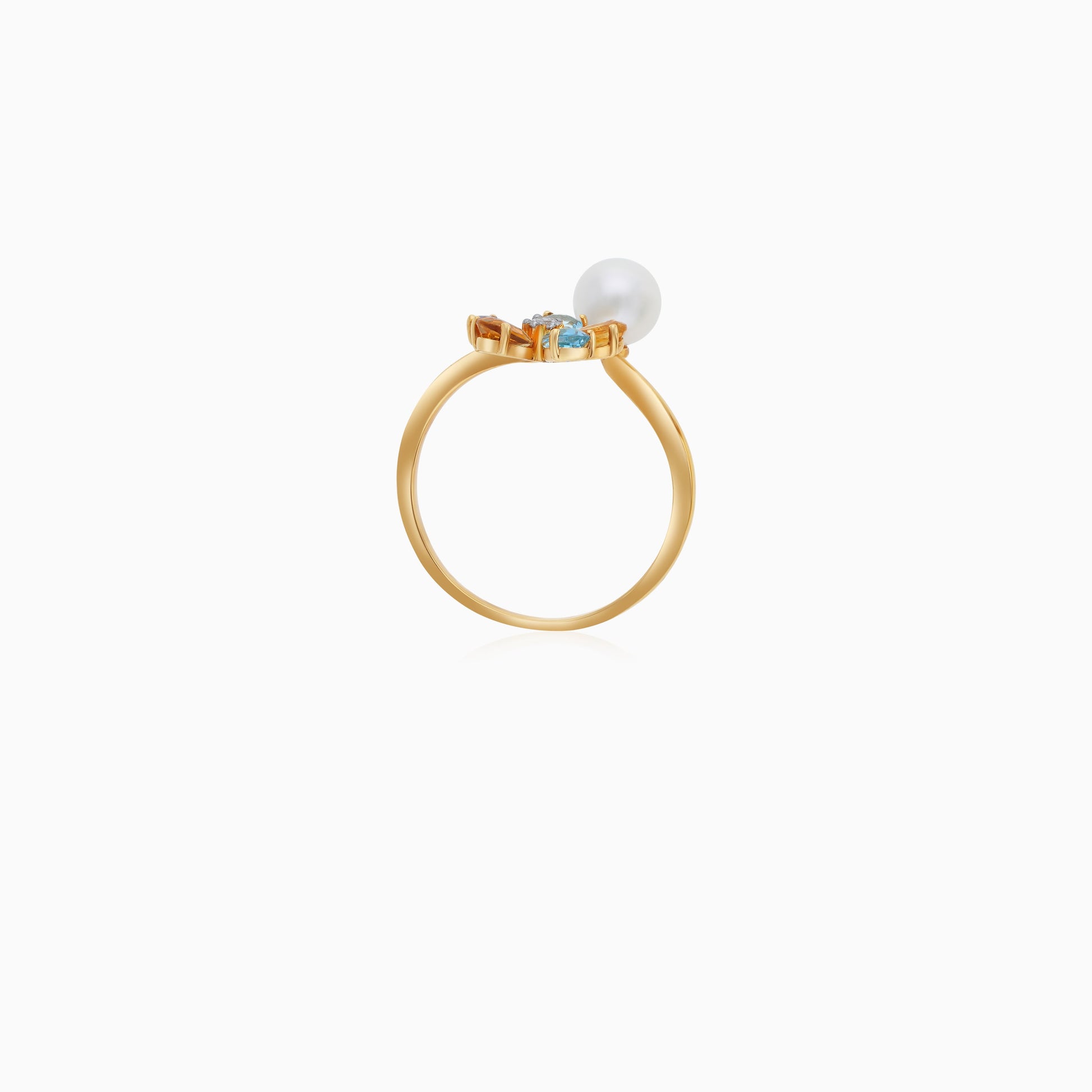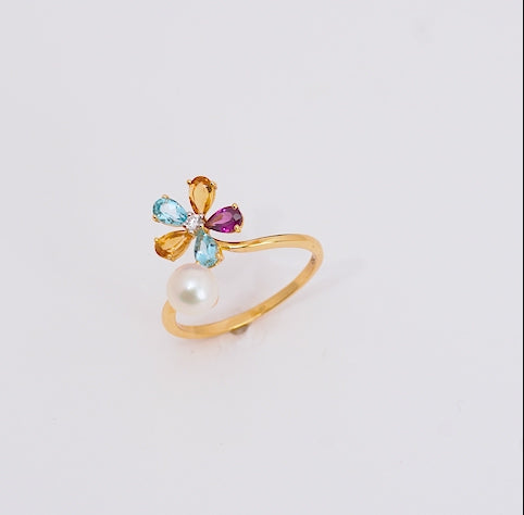 18K Yellow Gold Open Flower Ring with Diamonds, Gemstones & Single Pearl – Danah Collection