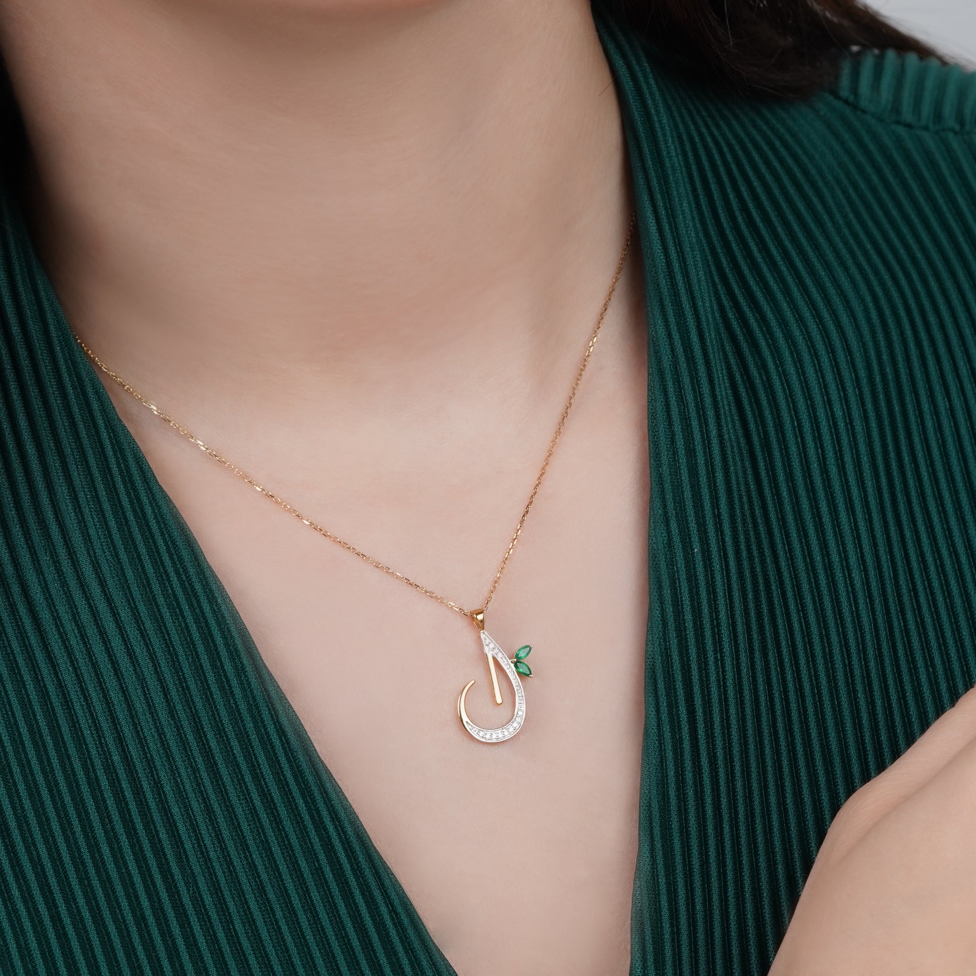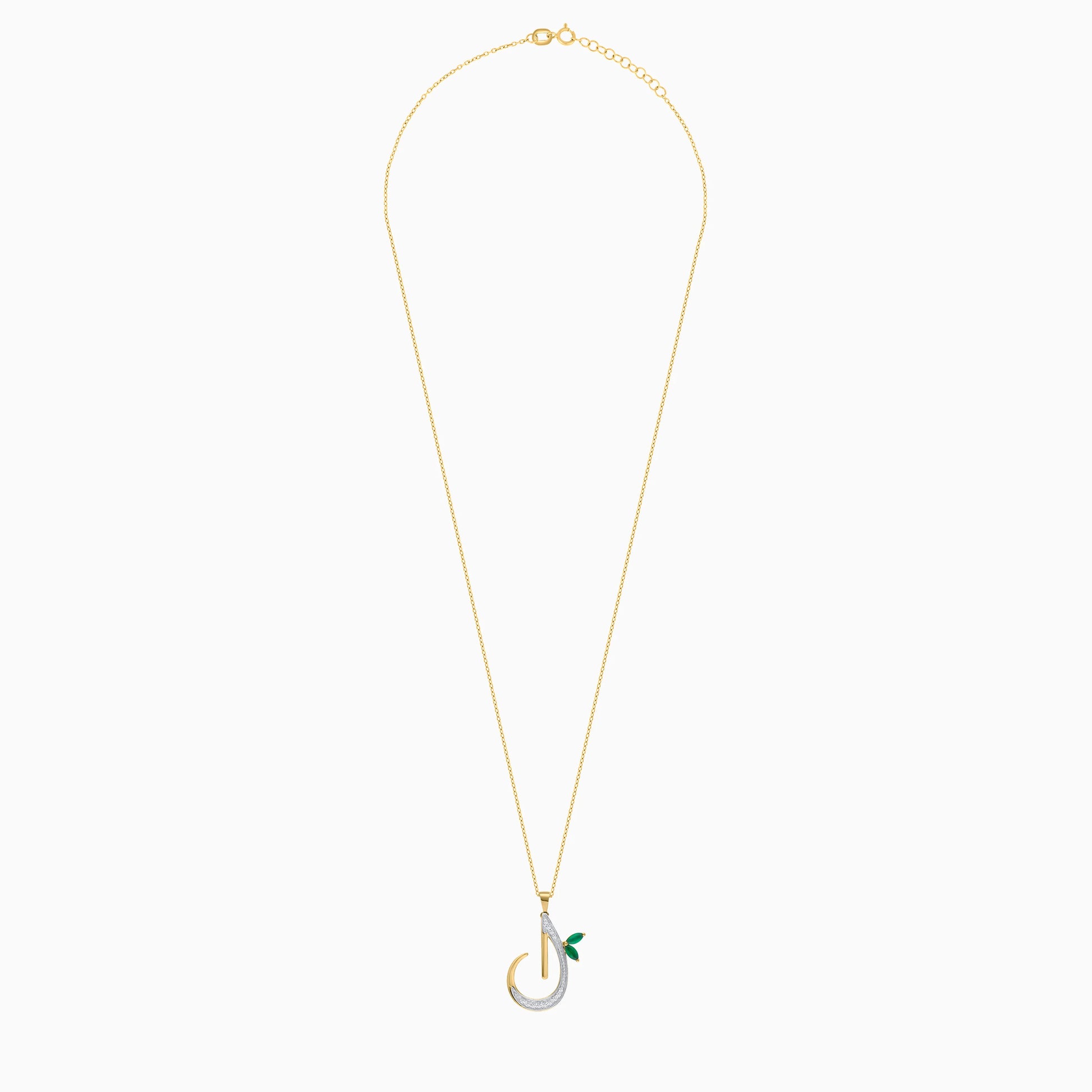 18K Yellow Gold Necklace featuring a pendant studded with natural diamonds, forming the elegant Laam Arabic letter in stunning traditional Arabic calligraphy. The pendant is adorned with gorgeous agate stones, enhancing its luxurious appeal. This exquisite piece is part of the Horoufi Diamond Collection, celebrated for its beautiful blend of cultural heritage and fine craftsmanship.