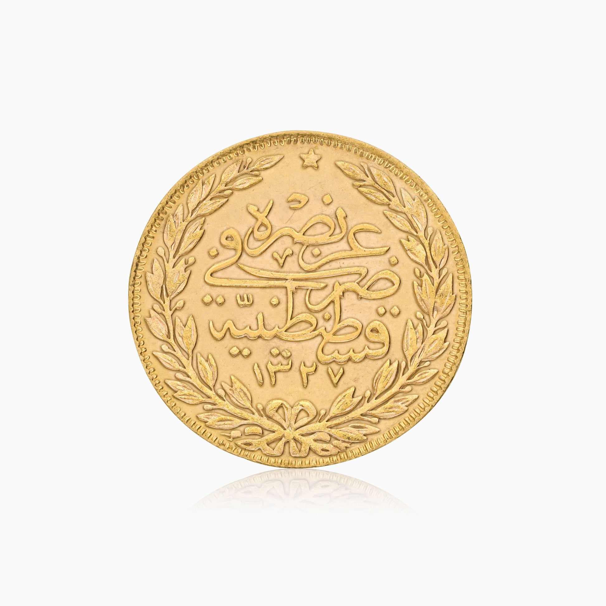 Authentic Ottoman 22k gold coin from the reign of Sultan Mehmed V Reşad, minted in Constantinople in the 8th regnal year, 1334 AH / 1916 CE. Bearing the honorific title "Al-Ghazi," this coin is a testament to the Ottoman Empire's rich numismatic heritage during a pivotal historical period.