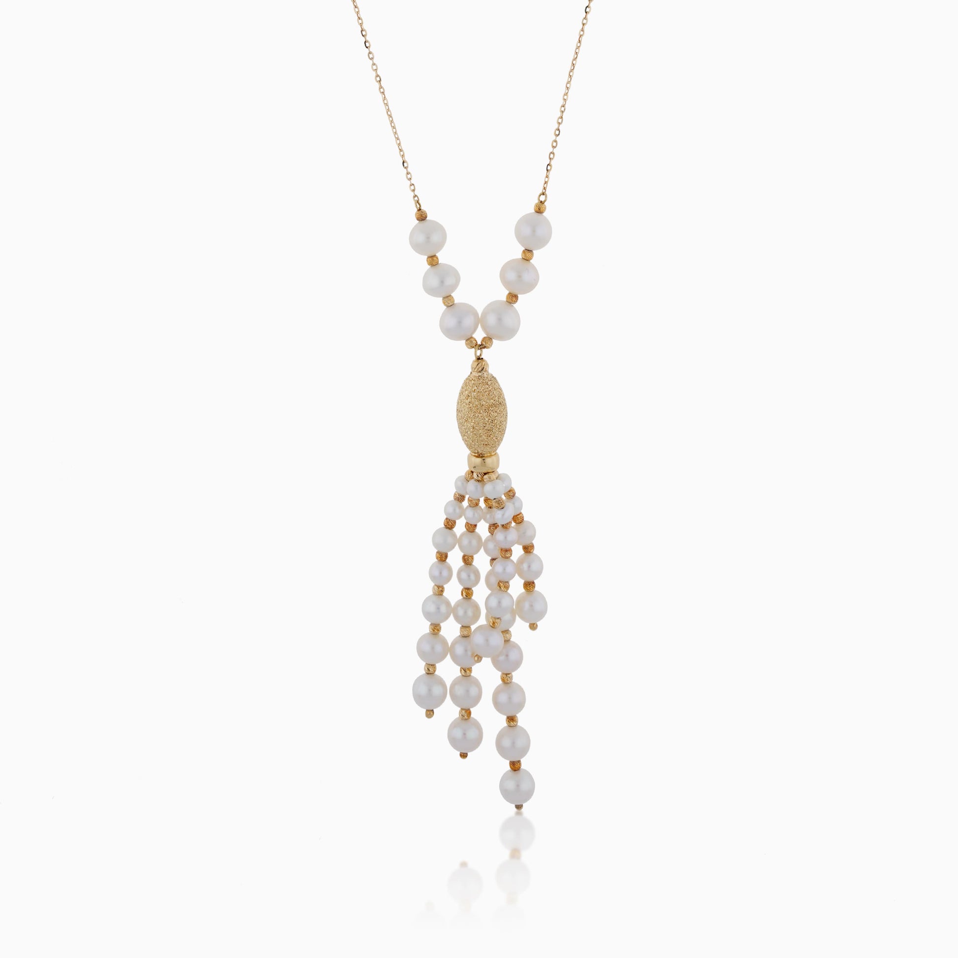 18K Yellow Gold Necklace Adorned with Four Strands of Dangling Freshwater Pearls from the Danah Collection. Each pearl is carefully selected for its luster and quality, creating a graceful flow that enhances the necklace's luxurious design. The intricate craftsmanship and harmonious blend of gold and pearls make this piece a perfect symbol of sophistication, ideal for those who appreciate refined elegance in their jewellery.