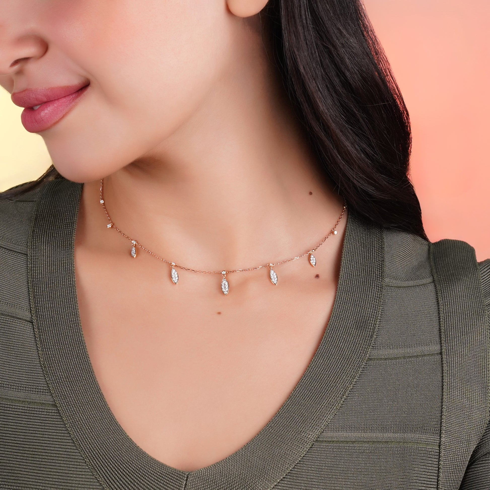 The warm and romantic hue of rose gold blends beautifully with the brilliance of diamonds, making it a timeless piece perfect for glamorous events or adding sophistication to your everyday style. Whether worn alone for a statement look or layered with other fine jewellery, this rose gold diamond choker is a must‑have for the modern woman who appreciates refined luxury.